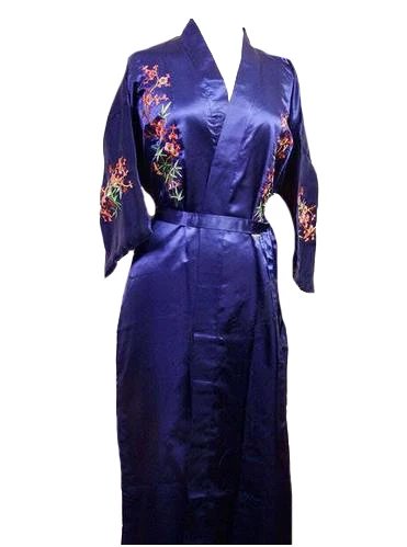 SPECIAL OFFERS Hot Sale Navy Blue Chinese Female Silk Embroidery Robe Gown Novelty Kimono Flower Nightwear Size S M L XL XXL XXXL W3S001 Online