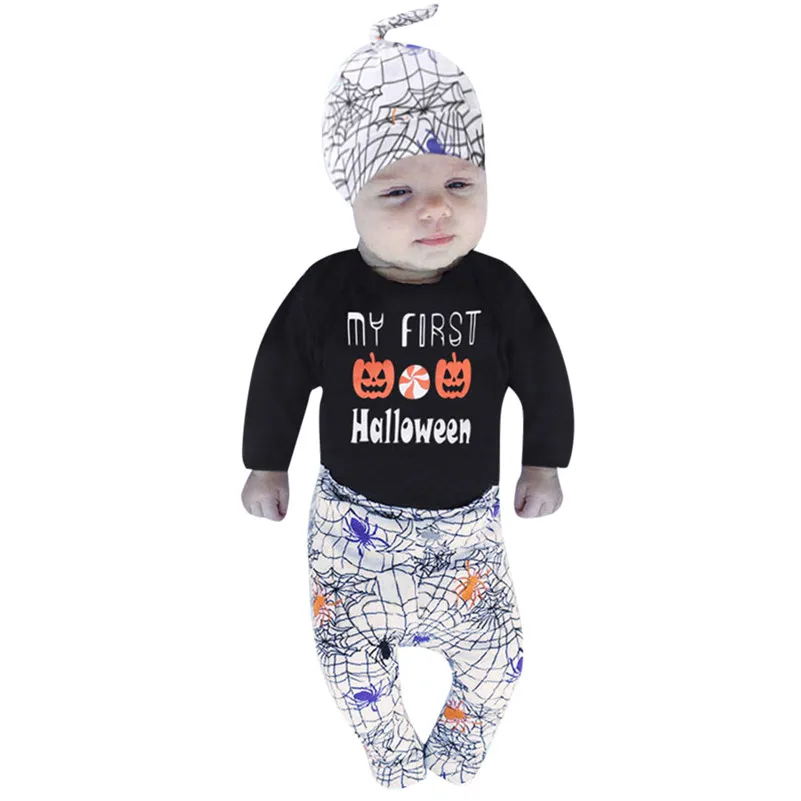SPECIAL OFFERS 0 2 Years Old Newborn Baby Letter Romper Tops Pumpkin Prin Pants Cap Halloween Clothes Sets for roupa infantil B2 one of the best