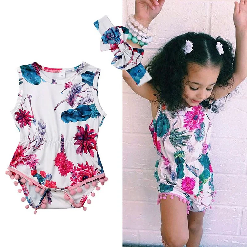 SPECIAL OFFERS Infant Cotton Pullover Summer Newborn Baby Girls Floral Rompers Headband Set Sleeveless Bodysuit With Tassel Design Jumpsuit Online